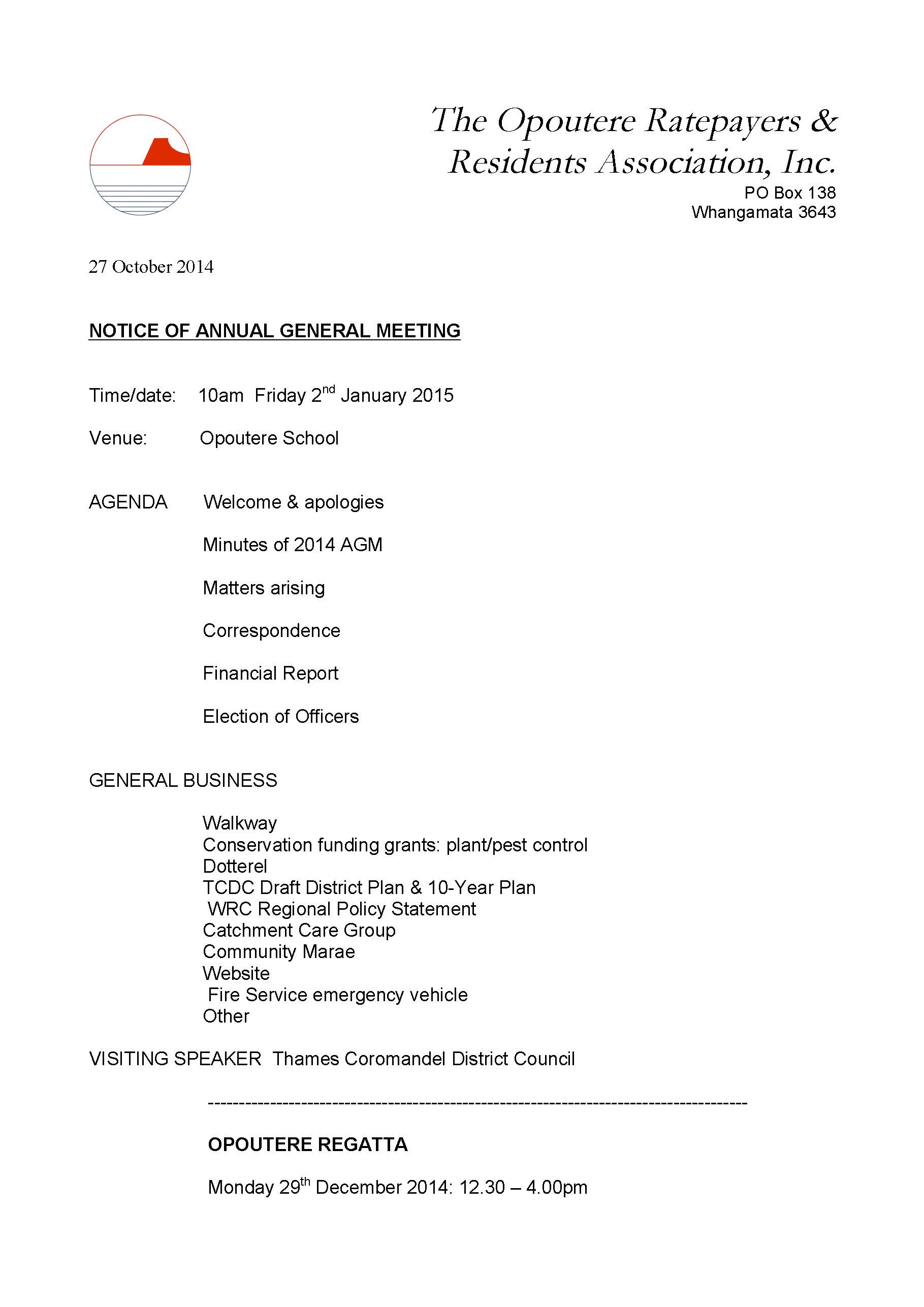 Don’t forget that the Opoutere Ratepayers and Residents’ Association is holding its 2015 AGM on Friday January 2, 10am at the Opoutere School.