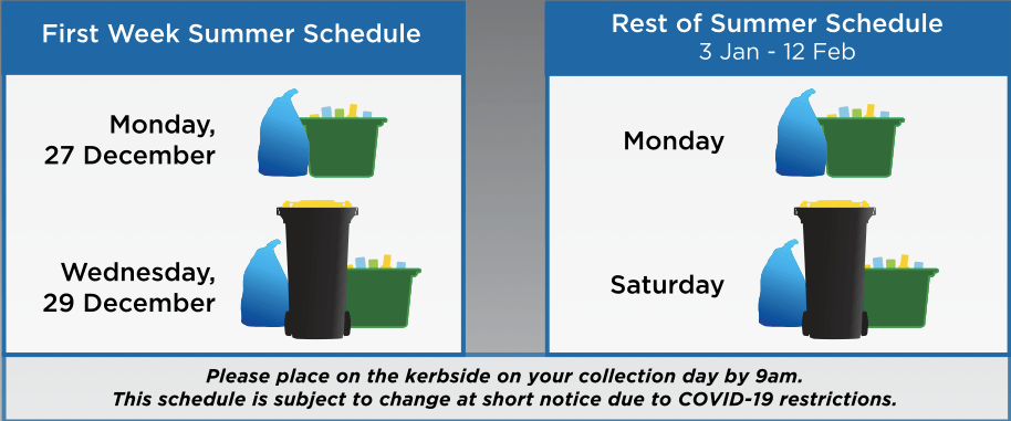 Summer Rubbish and Recycling Schedule – the summer collection schedule begins on Monday 27 December 2021 and ends Saturday 12 February 2022.