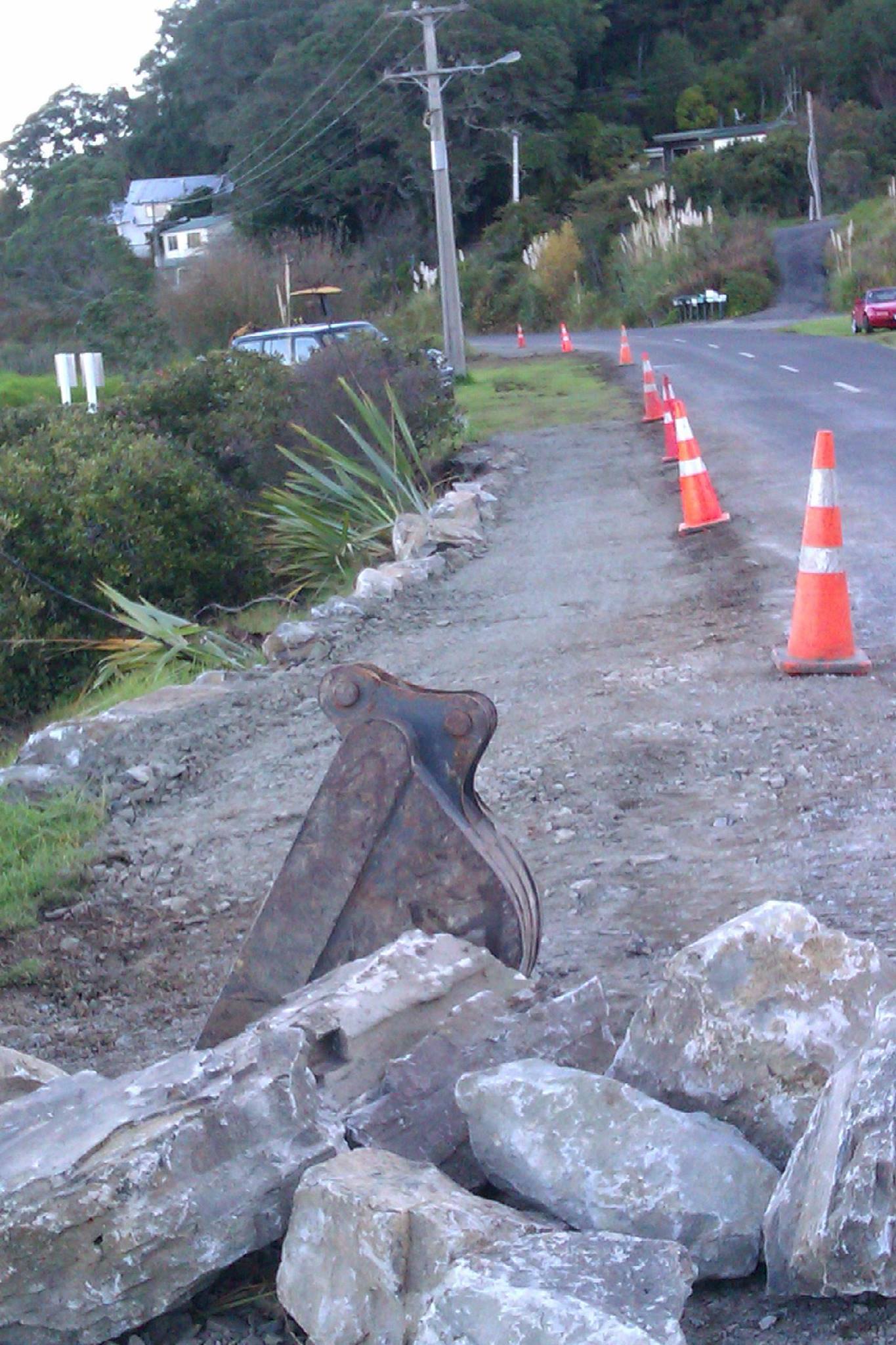 In mid-May a large pile of rocks in Bruce’s Bay reserve indicated that something was about to happen! Over the next few days the rocks had been placed to widen the edge of the road and compacted metal placed adjacent to the road tarmac. It may appear that the work has stalled just beyond the bend in the road opposite Wharekawa Place, but Garry Towler, TCDC’s Area Manager for Whangamata, assures the community that the main contractors, Walkway Solutions, are due back in Opoutere very soon and that the job will be completed by the end of June.